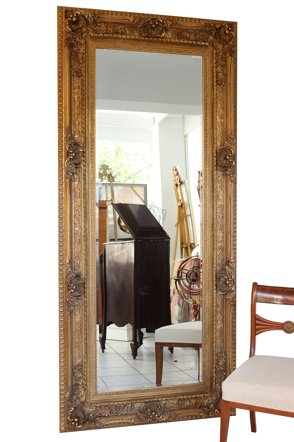 Wunderschöner Wandspiegel nach altem Vorbild hergestellt. Wie auf den Fotos zu sehen, eine hochwertige und dekorative Arbeit im antiken Stil. Durch aufwendige Handarbeit wird der Artikel traditionell bearbeitet, um ein antikes Erscheinungsbild zu erhalten. Die Maße lauten wie folgt: 98cm x 218cm x 9cm. Die Größe der Spiegelfläche ohne Rahmen beträgt: 60 x 180cm (B x H). Das Gewicht beträgt 32kg.
